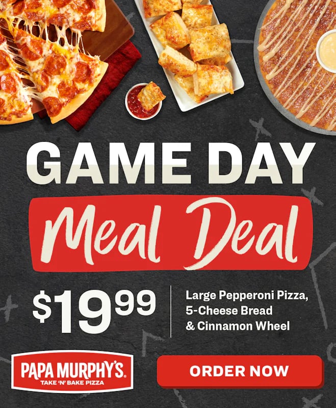 A winning lineup for game day! Get a Large Pepperoni Pizza, 5-Cheese Bread, and a Cinnamon Wheel for just $19.99.